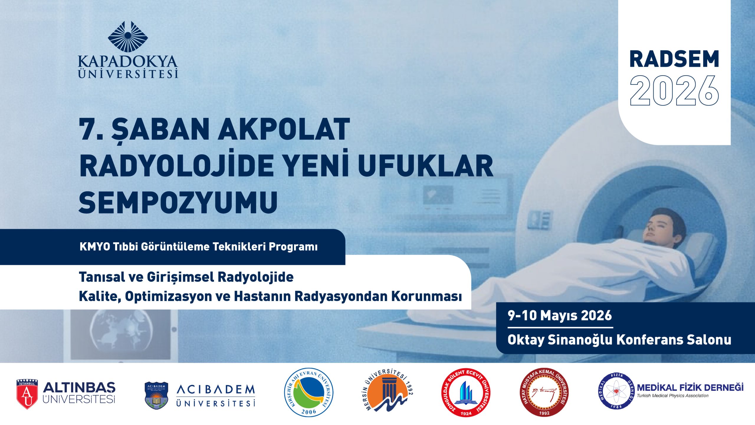 Bu yılki sempozyumumuzu “Tanısal ve Girişimsel Radyolojide Kalite, Optimizasyon ve Hastanın Radyasyondan Korunması” teması ile Kapadokya Üniversitesi, Acıbadem Üniversitesi, Ahi Evran Üniversitesi, Altınbaş Üniversitesi, Hatay Mustafa Kemal Üniversitesi, Mersin Üniversitesi, Zonguldak Bülent Ecevit Üniversitesi ve Medikal Fizik Derneği katkılarıyla gerçekleştiriyoruz.